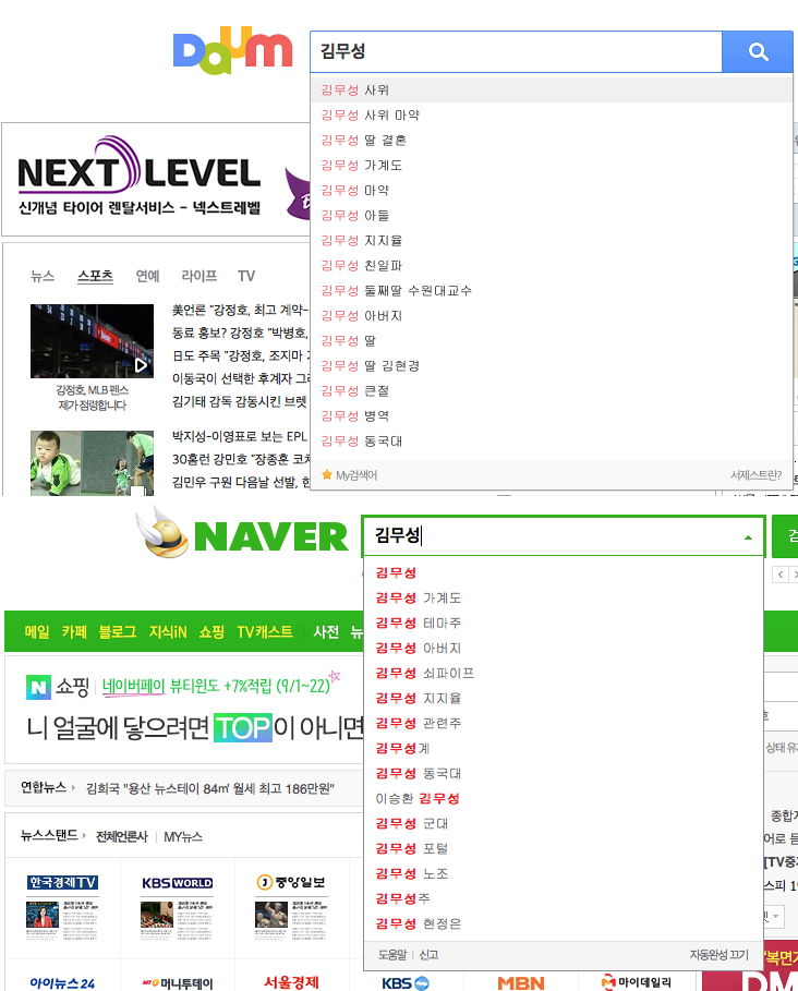 현재 다음과 네이버에서 김무성에 대한 관련 검색어.